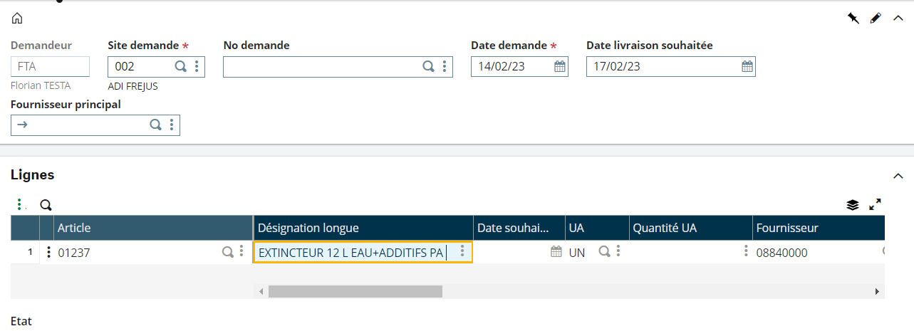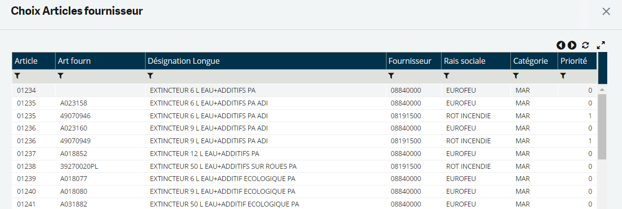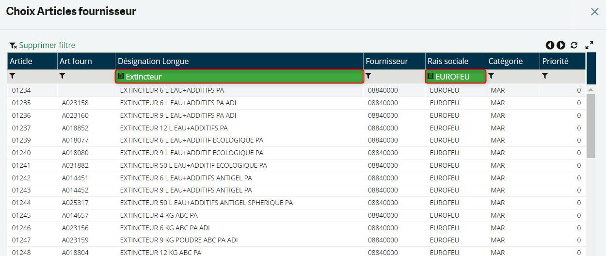 Exemple : nous cherchons un article via la désignation longue et la raison sociale. Dans notre exemple nous chercherons un Extincteur 12L eau + additif du fournisseur Eurofeu