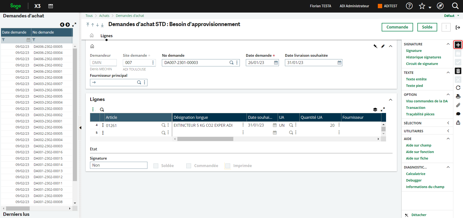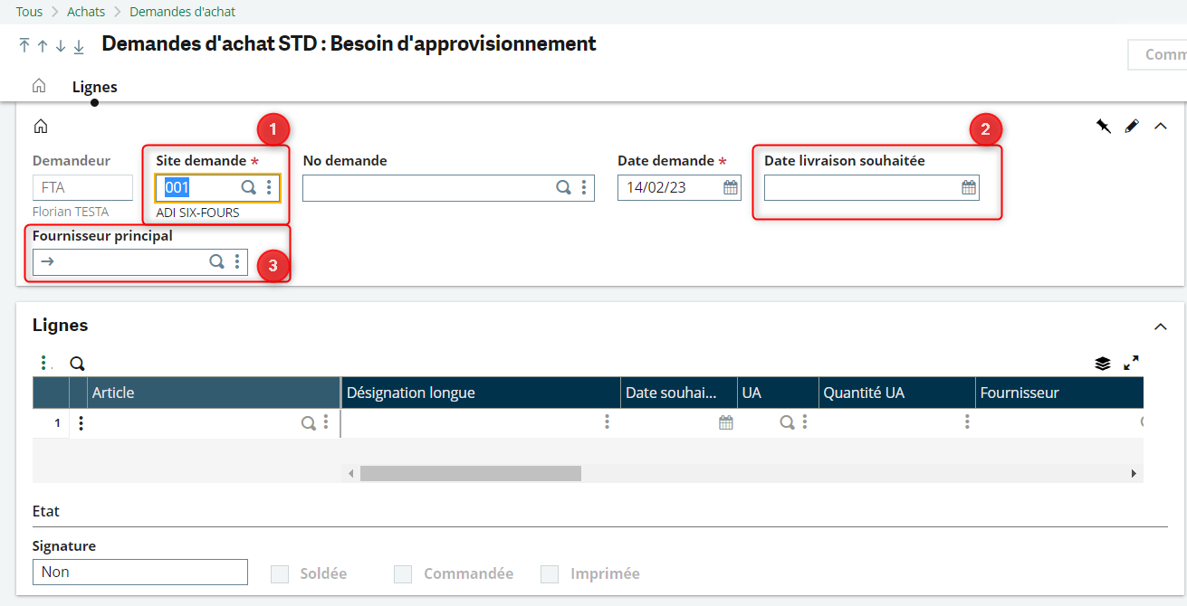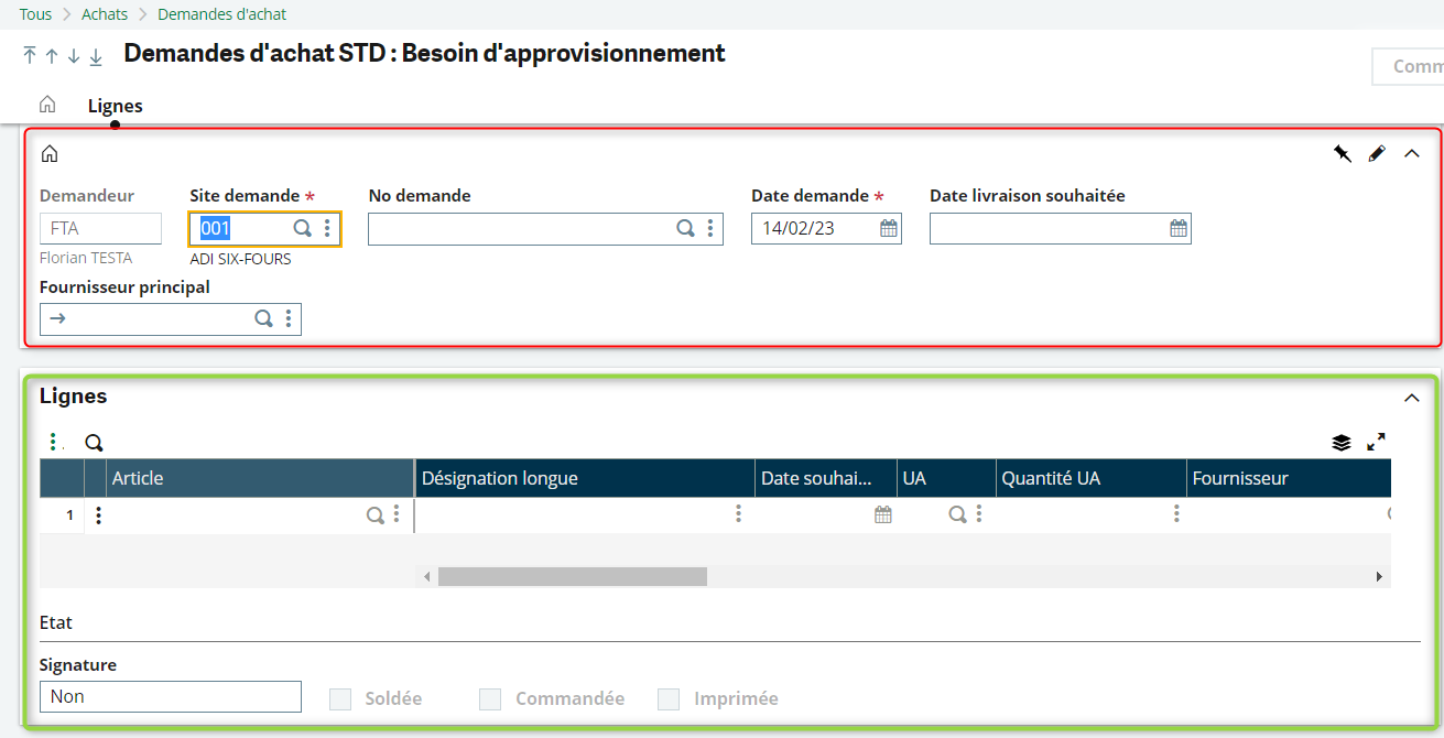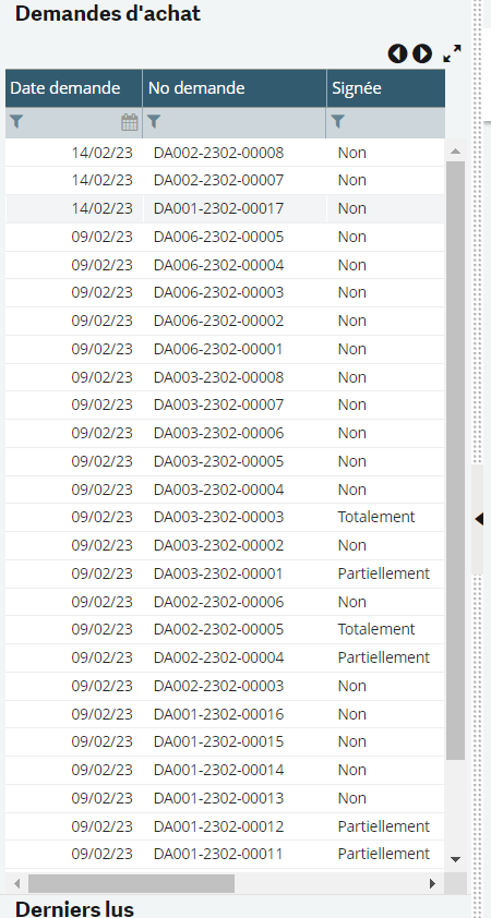 La fenêtre de demande d’achat va alors s’ouvrir. Afin de consulter nos demandes d’achats, nous allons utiliser la partie de gauche de la fenêtre (cf image ci-dessous)