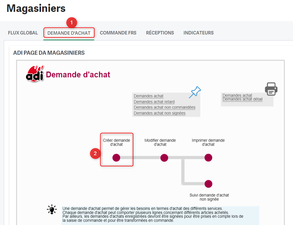 Pour rechercher une demande d’achat, nous répéterons le même processus que pour la création d’une demande d’achat. Il faut se rendre sur l’onglet Demande d’achat (n°1) et cliquer sur créer une demande d’achat (n°2)