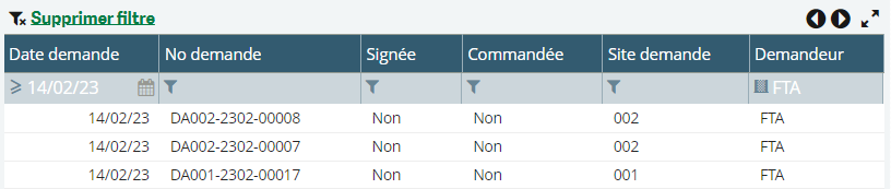 Exemple : nous recherchons toutes les commandes de FTA réalisées le 14/02