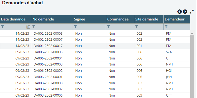 Une fois votre demande d’achat identifier, vous pouvez la modifier en cliquant sur la colonne que vous souhaitez corriger.