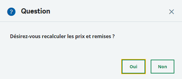 La quantité ayant été modifié un pop-up apparait nous demandant si nous souhaitons mettre à jour les prix