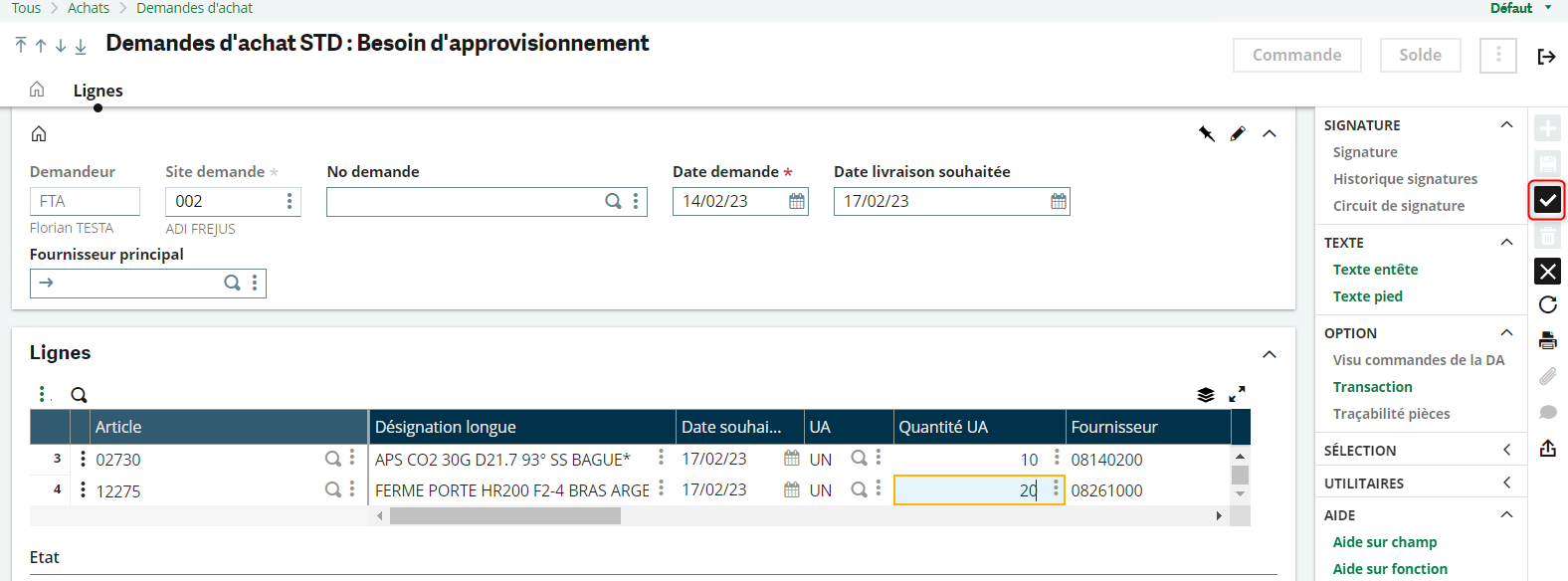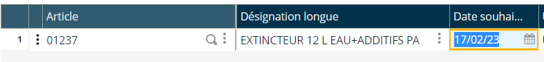 Il suffit de sélectionner l’article afin de le faire apparaitre dans le listing de notre demande d’achat
