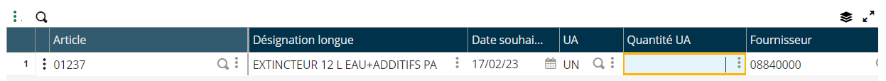 Exemple : Nous nous sommes trompés dans la commande précédente, et nous souhaitons non pas commander 10 extincteurs mais 8. Il suffit de cliquer dans la Quantité UA, changer le nombre et de valider la modification en cliquant sur