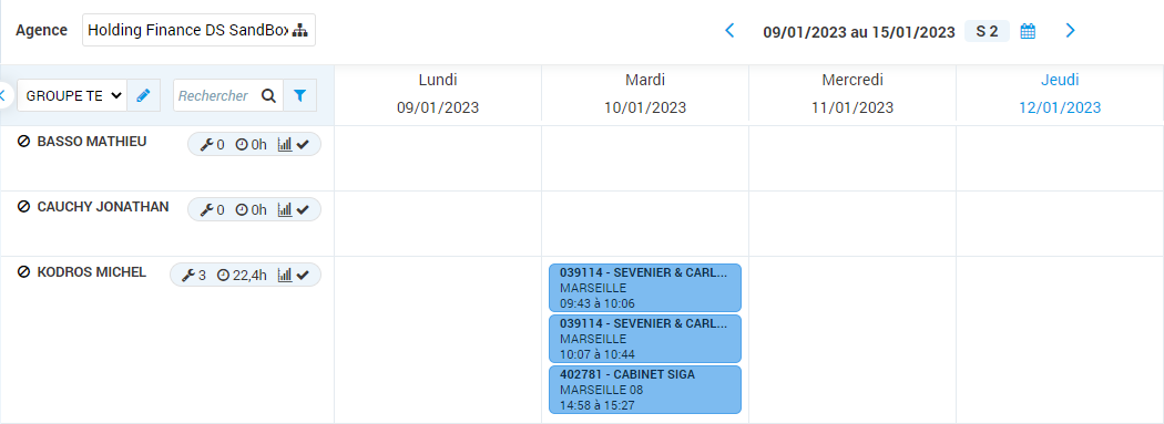 9. L’affichage de votre groupe s’affiche alors sur la vue du planning