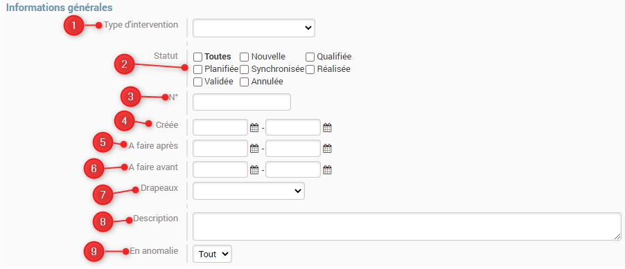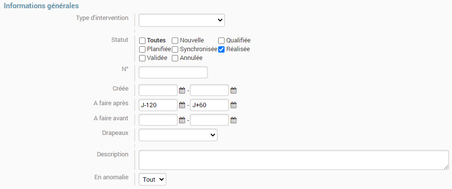 2. Informations générales qui permet de délimiter notre champs de recherche par les dates, le type d’intervention mais aussi le statut.