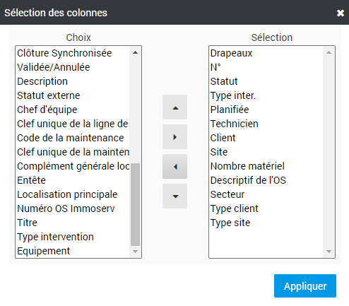 4. Sélection des colonnes : Ce champs permet de sélectionner des colonnes à afficher. Nous conseillons d’avoir à minima ces colonnes sélectionnées :