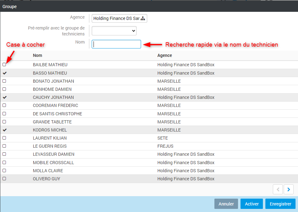 5. Une fenêtre va s’ouvrir avec le listing de tous les techniciens. Il suffira de sélectionner les techniciens de votre équipe en cochant les cases correspondant à vos techniciens