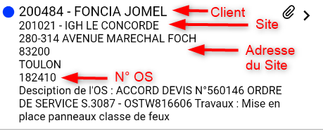 Sur chaque intervention, vous avez accès à plusieurs informations, telles que le type d’intervention, le client, le site, le formulaire, le numéro IMMOSERV et la description de l’OS.