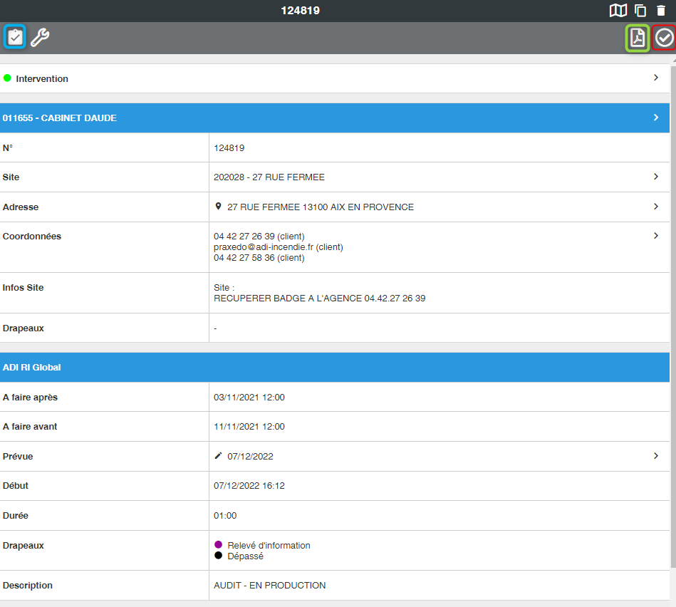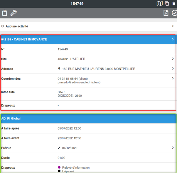 Le premier encart en rouge correspond aux informations client & site de l’intervention. On retrouve différentes informations telles que :