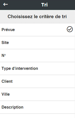 Vous pouvez également trier les interventions en touchant l’icône en haut à gauche de l’écran, puis touchez « Critère de tri ».