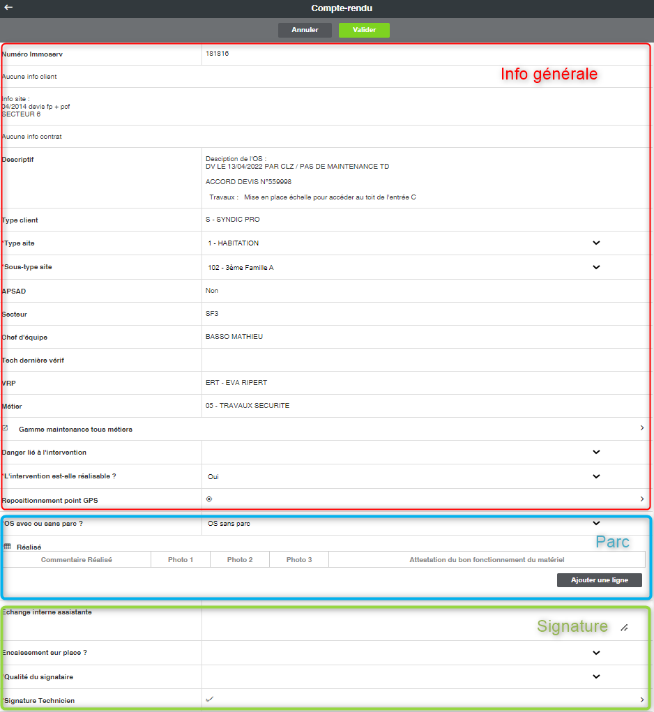 • La partie Info Générale contient toutes les informations sur le numéro d’OS IMMOSERV, le descriptif de l’OS, le type de client, le type de site, le secteur, le chef d’équipe et toutes autres informations contenues dans IMMOSERV