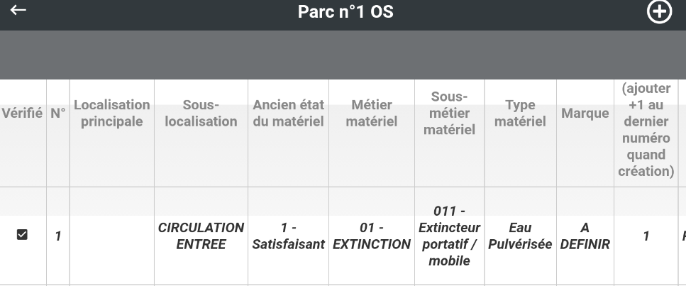 Une fois notre matériel trouvé, il suffit d’appuyer sur la ligne en question afin d’entrer dans le matériel concerné. Un nouvel affichage apparait qui sera commun à tous les types de formulaire comportant un parc.