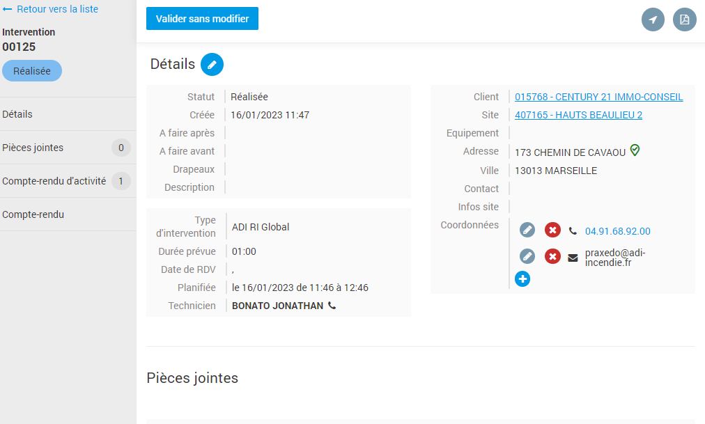 Détails contient toutes les informations global de l’intervention comme la date de création, le type d’intervention le technicien, le client, le site, les coordonnées.