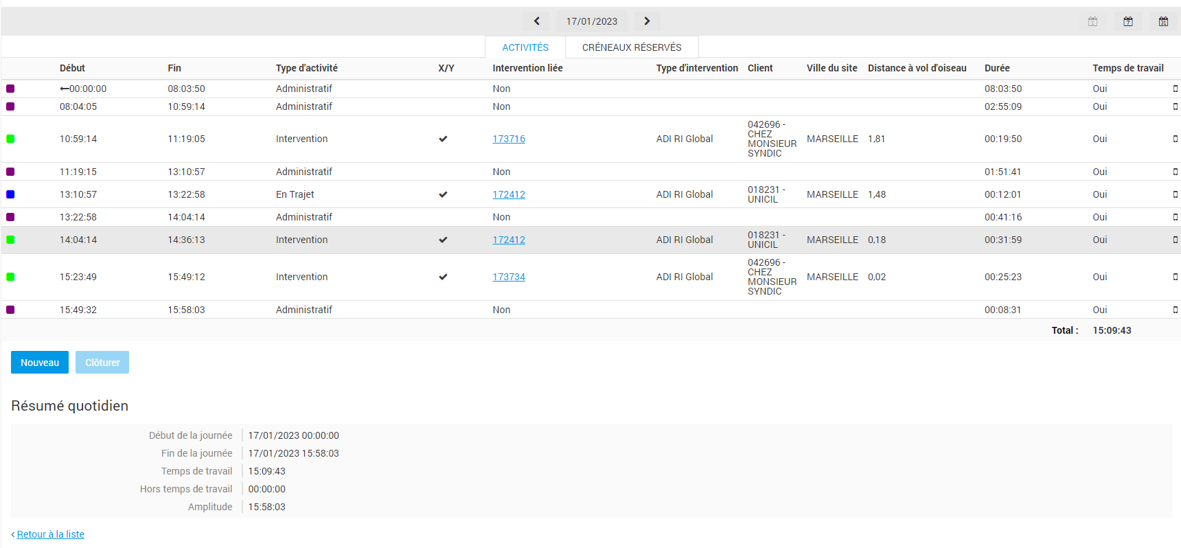 La production du technicien s’ouvre automatiquement sur le jour en cours. On peut modifier cet affichage de 3 façons différentes :