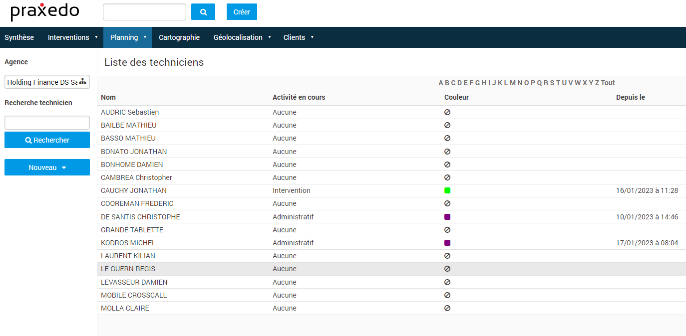 Le listing des techniciens de l’agence vient alors s’afficher par ordre alphabétique. On y retrouve :