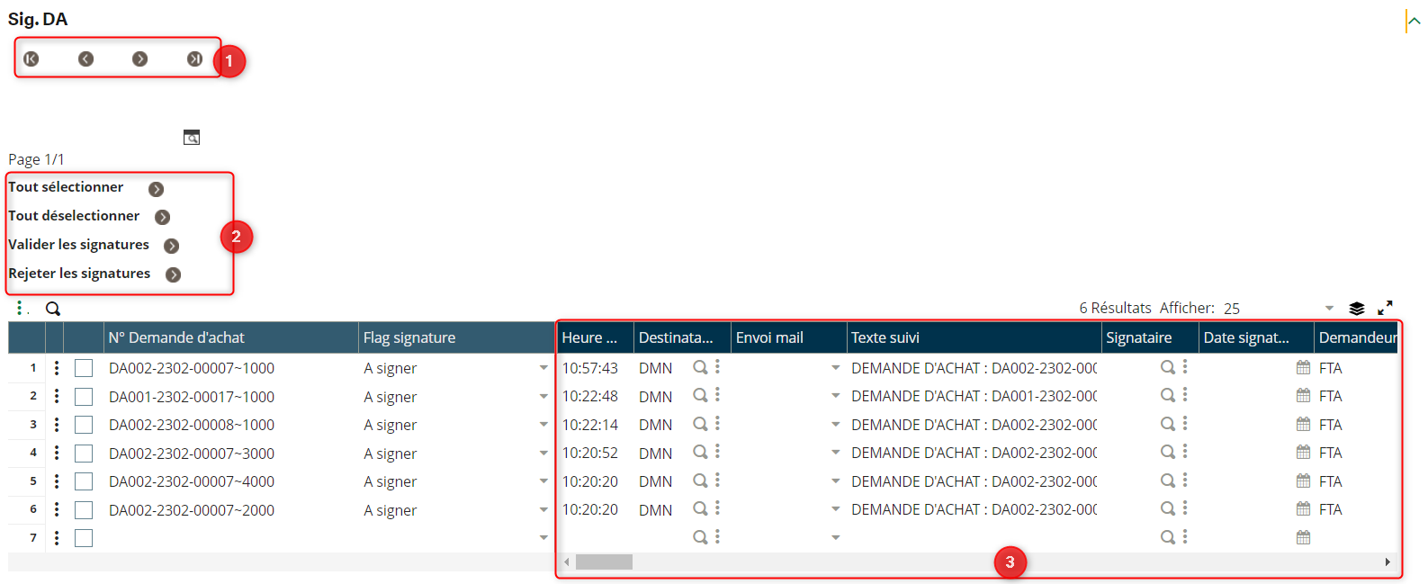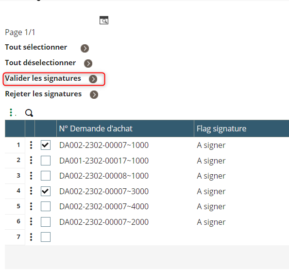 Après avoir sélectionné les lignes des demandes d’achat que nous souhaitons validés en les cochant. Il suffit valider les signatures sélectionnés en cliquant sur “Valider les signatures”